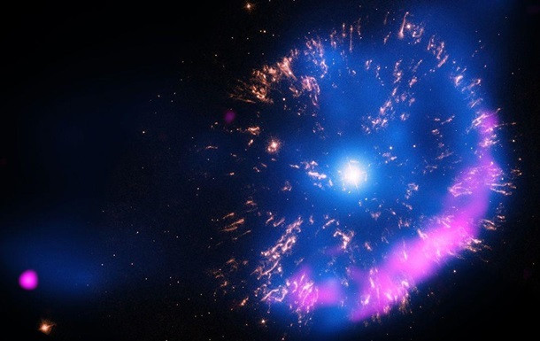 "Взрыв, похожий на фейерверк, выделяется на фоне черного космоса. Яркий белый центр взрыва излучает острые оранжевые вспышки. Дымчатое облако голубого цвета заполняет большую часть сверхновой, а фиолетовый спрей выстилает нижнюю правую границу взрыва", — говорится в сообщении.
