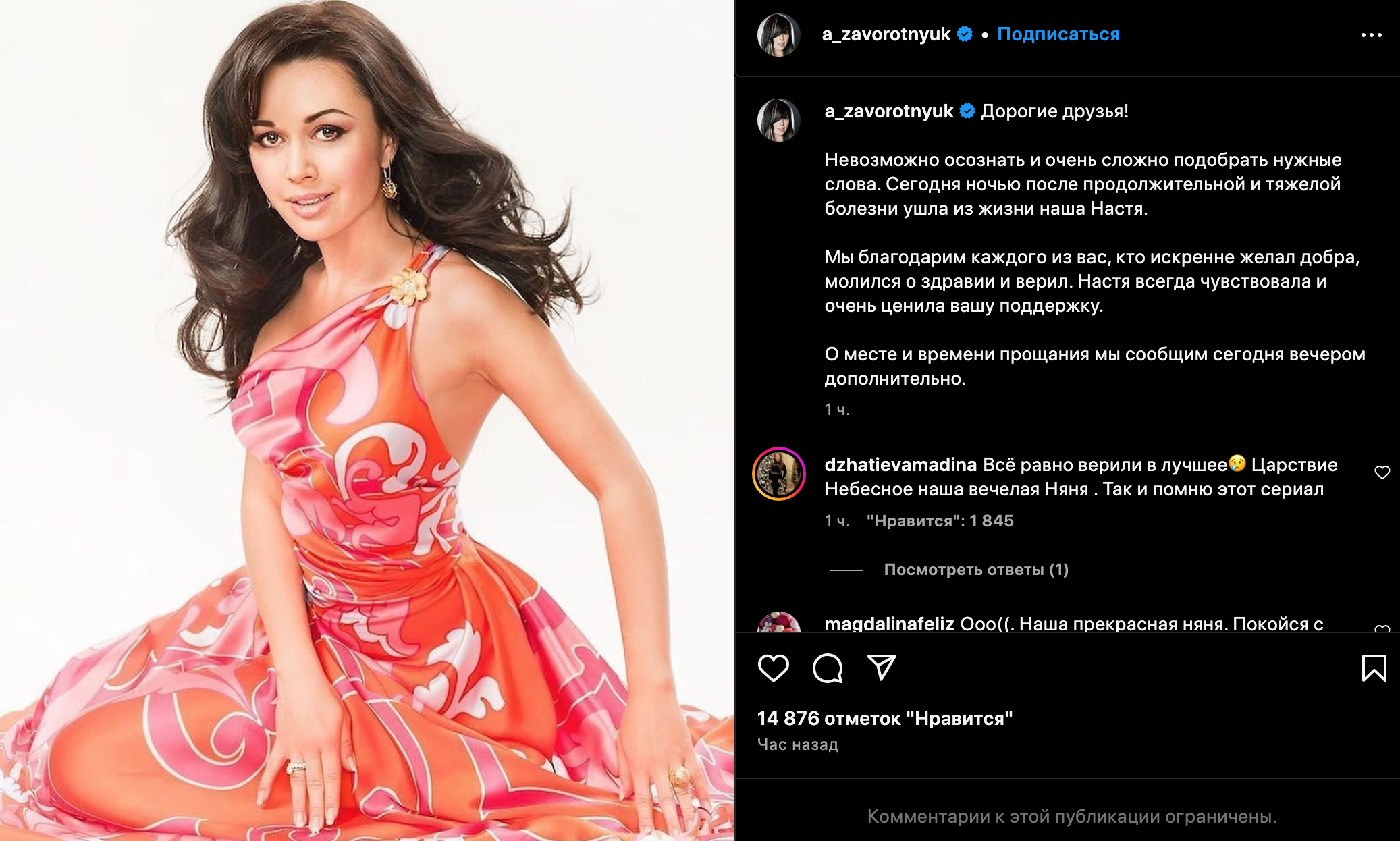 "Сегодня ночью после продолжительной и тяжелой болезни ушла из жизни наша Настя... О месте и времени прощания мы сообщим сегодня вечером дополнительно", - говорится в сообщении.