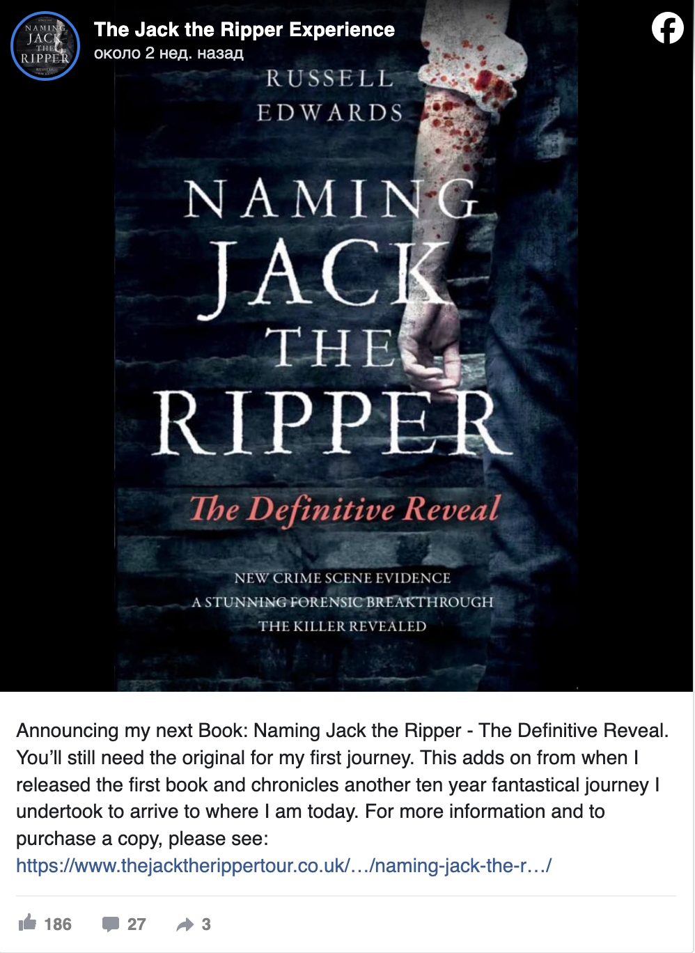 Вышла книга Рассела Эдвардса "Имя Джека-потрошителя: окончательное разоблачение", в которой на основании фактов происходит разоблачение самого страшного преступника 19-го века, передает Час Пик со ссылкой на СМИ.
