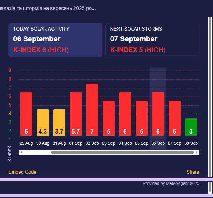 По прогнозам Meteoagent, индекс может подняться до 5 и выше, что соответствует буре класса G1.