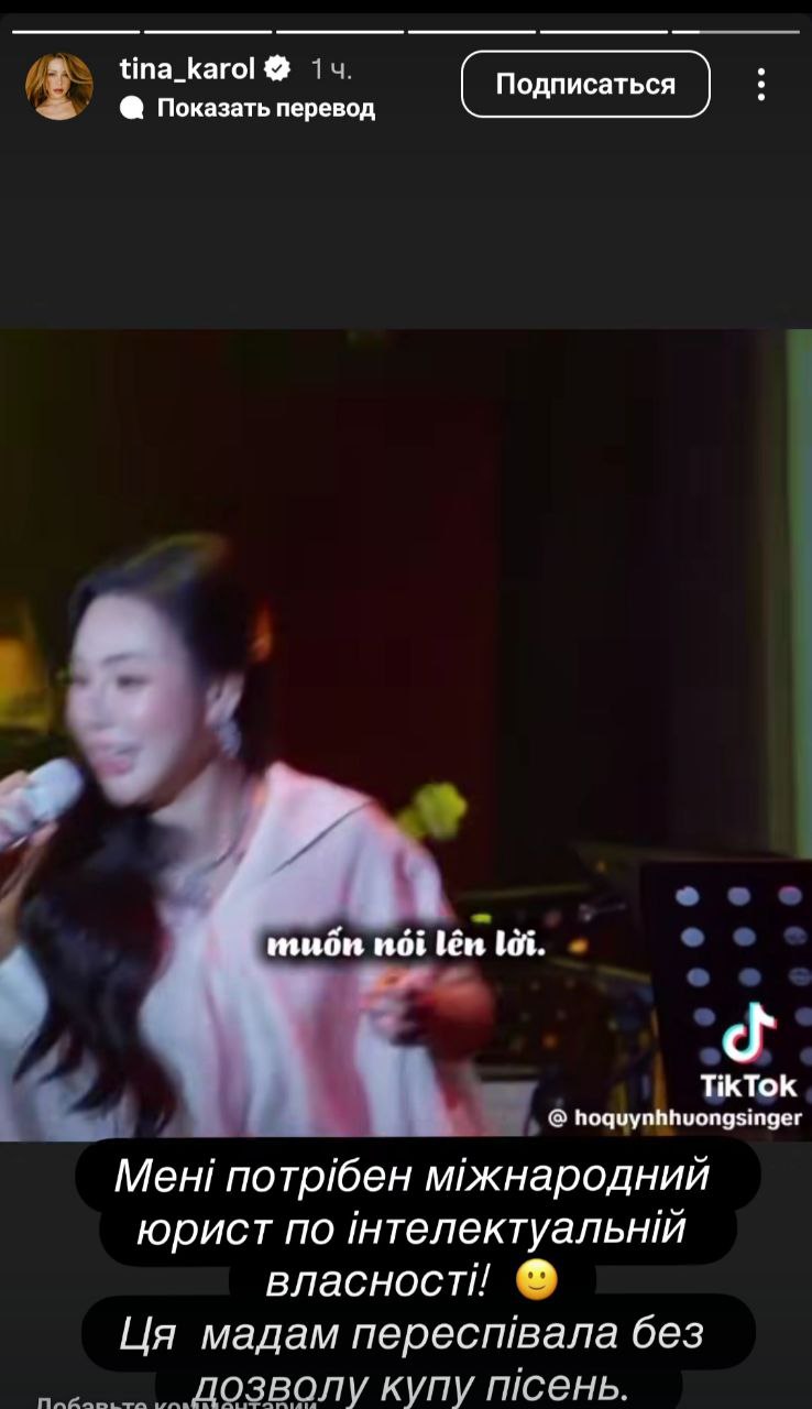 Украинская певица Тина Кароль публично выразила свое недовольство из-за видео в соцсетях, на которых артистка из Вьетнама исполняет ее песни без официального разрешения.