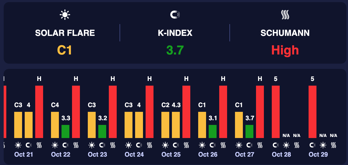 В понедельник, 27 октября, ожидаются не сильные магнитные колебания, которые уже во вторник, 28 октября, перерастут в магнитную бурю с К-индексом 5 (красный уровень), способную влиять на самочувствие метеозависимых людей. В среду, 29 октября, также будут сильные магнитные колебания с К-индексом 5.