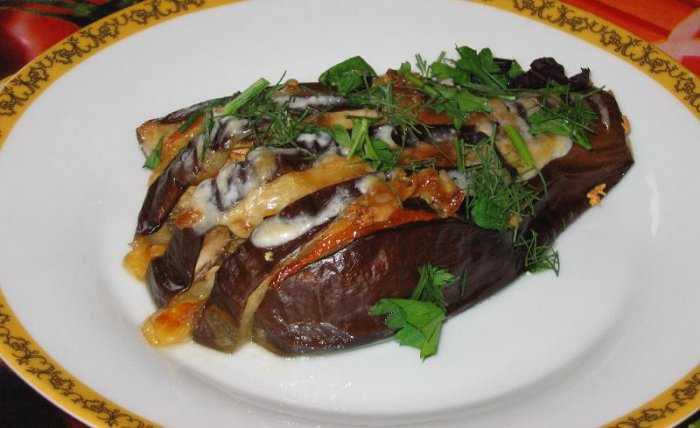 Выложить подготовленные половинки баклажанов в смазанную маслом форму или на противень.