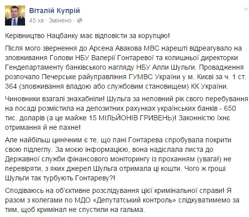"После моего обращения к Арсену Авакову, МВД наконец отреагировало на злоупотребления председателя НБУ Валерии Гонтаревой и бывшего директора Гендепартамента банковского надзора НБУ Аллы Шульги. Производство начало Печерское райуправление ГУМВД Украины в г. Киеве по ч. 1 ст. 364 (злоупотребление властью или служебным положением) УК Украины", - говорится в сообщении.