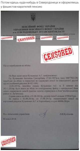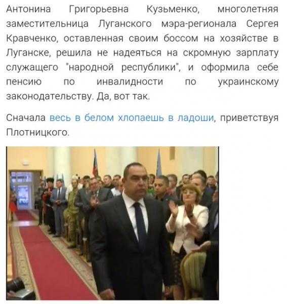 Заместитель так называемого "народного мэра" Луганска Антонина Кузьменко получает пенсию по инвалидности по украинскому законодательству. Об этом сообщил в своем Twitter Роман Рябчук, который опубликовал документ из Пенсионного фонда Украины.