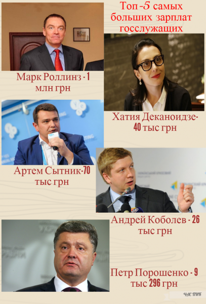 Сегодня зарплаты госчиновников не слишком отличаются от средней зарплаты украинца. Согласно данным Госстата, летом 2015 года средняя зарплата украинца составляла 4390 грн, а минимальная зарплата в Украине на сегодняшний день составляет 1378 грн. Средний оклад министра сейчас составляет 6 тысяч грн. Кстати, до Евромайдана зарплаты депутатов составляли около 17-18 тысяч гривен в месяц.