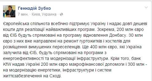 "30 млн евро из них уже направлены на ремонт общежитий и хостелов для размещения вынужденных переселенцев. Еще 400 млн евро, которые Украина привлекла от ЕИБ, будут направлены на программы по энергоэффективности и модернизации инфраструктуры. Кроме того, банк KfW выделил Украине 200 млн евро макрофинансовой помощи и 300 млн - на модернизацию энергетики, инфраструктуры и систем жизнеобеспечения на Востоке", - отметил Зубко.