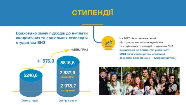 Сообщается, что проект государственного бюджета Украины на 2017 год предусматривает увеличение стипендиального фонда более, чем на 500 миллионов гривен, по сравнению с показателем 2016 года, и в 2017 году размер стипендиального фонда составит 5,8 млрд грн.