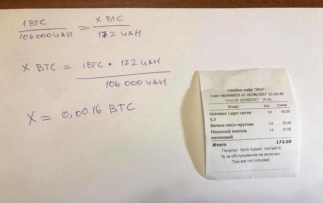 Сейчас некоторые украинские фирмы начинают принимать оплату в криптовалюте. Например, в столичном кафе клиент расплатился Биткоинами.