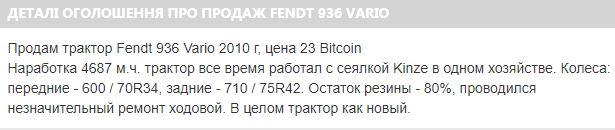 А сегодня житель Херсона разместил в сети объявление о продаже подержанного трактора за биткоины. На сайте Traktorist.ua продавец просит за трактор «Fendt 936 Vario» 23 биткоина. Неизвестно, заинтересует ли предложение потенциальных покупателей, ведь по сегодняшнему курсу заявленная цена трактора эквивалентна 120 тыс. долларов.