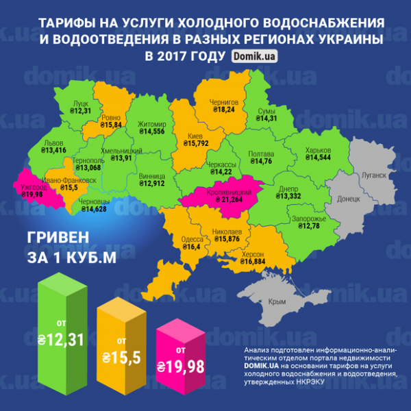 Согласно инфографике, составленной порталом Domik.ua самая высокая цена на воду зафиксирована в Кропивницком, самая низкая среди регионов Центральной Украины — в Виннице (12,912 грн).