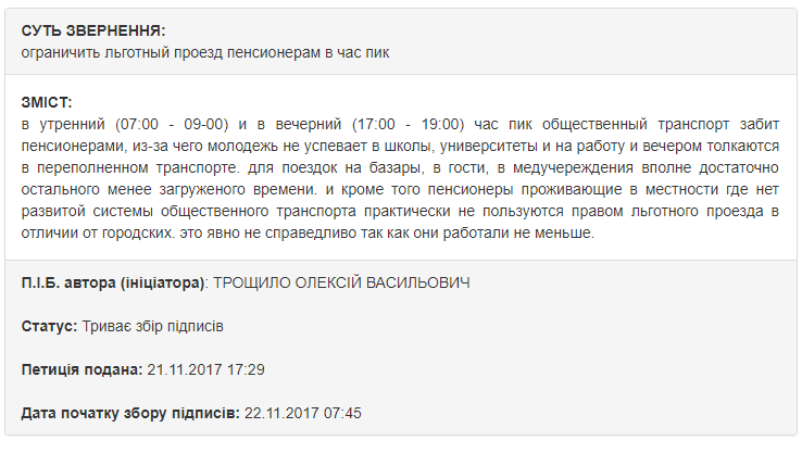 Аналогичная петиция опубликована и на сайте горсовета Кременчуга. По словам автора, пенсионерам для поездок в гости, на рынок или в больницу будет достаточно другого времени, чем 7-9 часов утра и 17-19 часов вечера.