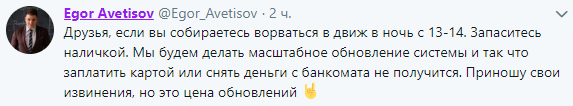 «Мы просим прощения у клиентов за возможные неудобства, но эта работа необходима для того, чтобы еще быстрее обрабатывать все большее количество безналичных платежей клиентов, - отмечает пресс-служба банка. - Технологическая пауза в работе процессинга займет непродолжительное время, поэтому советуем клиентам перенести активные шопинг-сессии в интернет-магазинах или осуществления каких-либо других безналичных расчетов на утренние часы».
