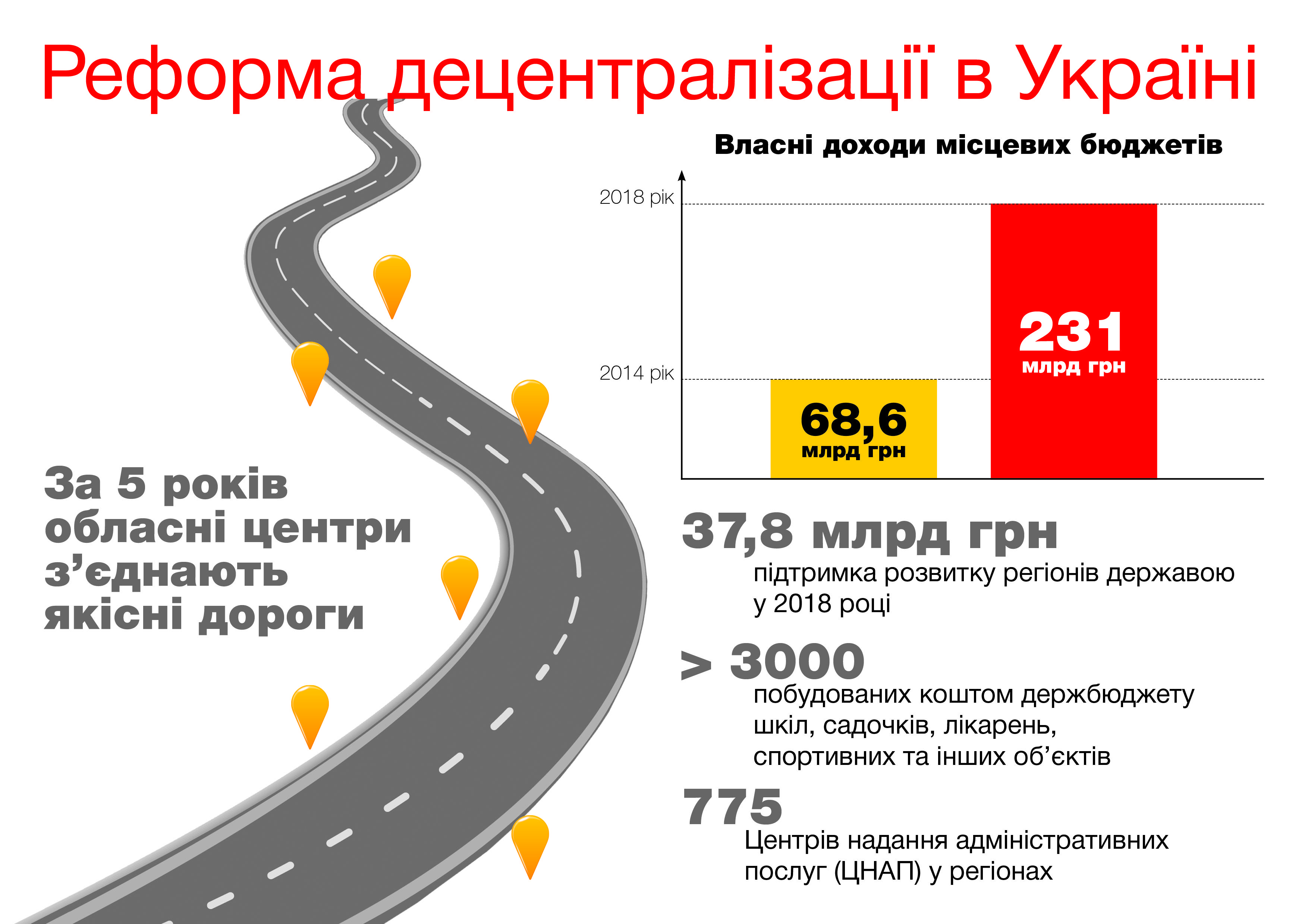За час, який минув, створені 874 об’єднані громади, які здобули повноваження, ресурси, землю у комунальну власність від держави. Власні доходи місцевих бюджетів зросли з 68,6 млрд грн у 2014 році до 231 млрд у 2018 році. Окрім цього, державна підтримка розвитку регіонів цього року становить рекордні 37,8 млрд грн. Загалом кількість побудованих та відновлених коштом держбюджету шкіл, садочків, лікарень, водогонів, енергоефективних котелень та інших об’єктів за чотири роки перевищила три тисячі. Адміністративні послуги в Україні також стають доступнішими поряд із місцем проживання – по всій країні створені 775 Центрів надання адміністративних послуг – прозорих офісів, де без бюрократії та зловживань з боку чиновників люди отримують необхідні дозволи, довідки, виписки.