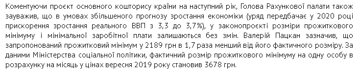 “В условиях увеличенного прогноза роста экономики (правительство предусматривает в 2020 году ускорение роста реального ВВП с 3,3 до 3,7%), в законопроекте размеры прожиточного минимума и минимальной заработной платы остаются без изменений”, - отмечается в сообщении.