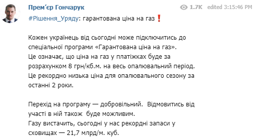 "Каждый украинец с сегодняшнего дня может подключиться к специальной программе «Гарантированная цена на газ».