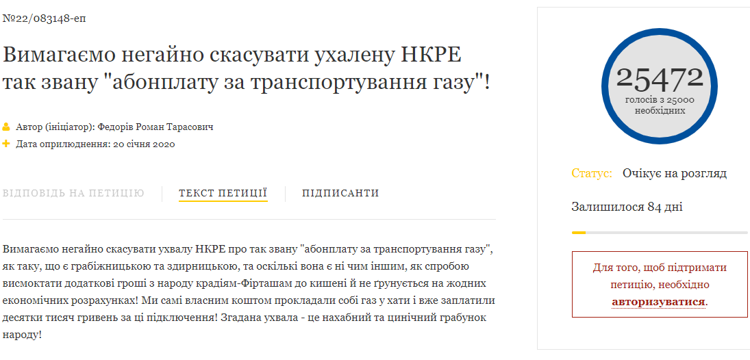 Петиция на сайте Президента Украины с требованием отменить абонплату за транспортировку газа набрала необходимое для рассмотрения количество голосов, сообщает Час Пик.