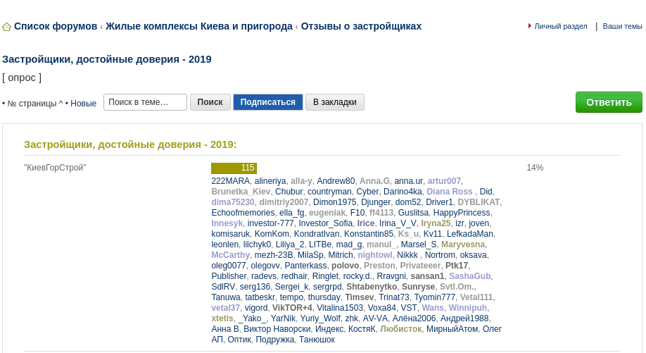 На форуме Domik.ua составлен рейтинг застройщиков, достойных доверия в 2019 году на основании опроса пользователей. Первое место форумчане отдали «Киевгорстрою», второе — «КАН Девелопмент», а третье — «Интергал-Буду». У всех трех компаний по состоянию на начало 2020 года нет активных долгостроев, где задержка сдачи в эксплуатацию составляет больше 1 года от первоначально заявленной даты.