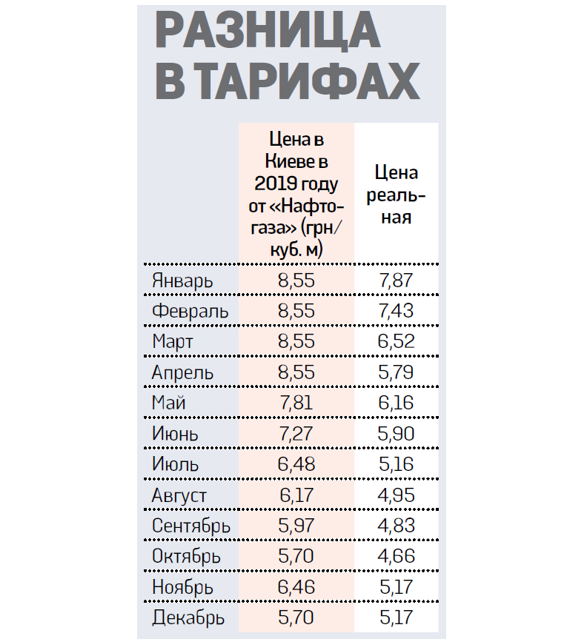 В таблице приведена фактическая и реальная стоимость газа на примере Киева.