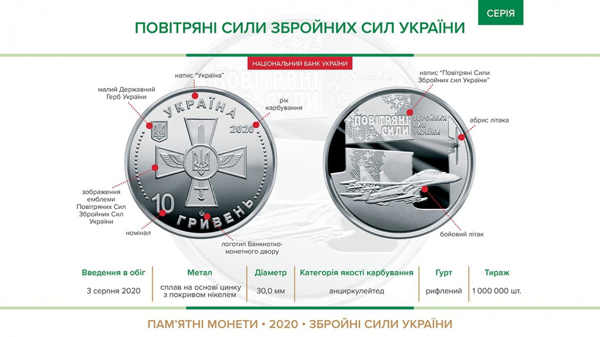 Нацбанк в обращение выпустит новую памятную монету "Воздушных сил Вооруженных сил Украины" номиналом 10 грн. Она появится в обращении с 3 августа.