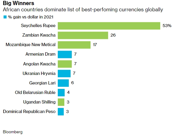 На первом месте - сейшельская рупия. Эта валюта укрепилась на 2,9% по отношению к доллару, в результате чего ее прирост в 2021 году составил 60% - лучший результат среди 146 валют всего мира. Кроме сейшельской рупии в ТОП-10 также вошли четыре другие африканские валюты.