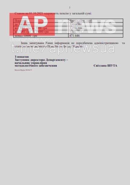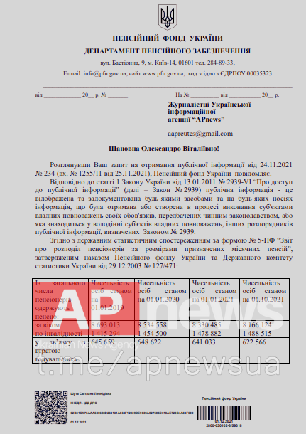 Сообщается, что по состоянию на октябрь 2021 года те или иные виды пенсии получают 10 945 145 украинцев - 8,1 млн человек получают пенсии по возрасту, 1,4 млн - по инвалидности, 622 тыс. - в связи с потерей кормильца.