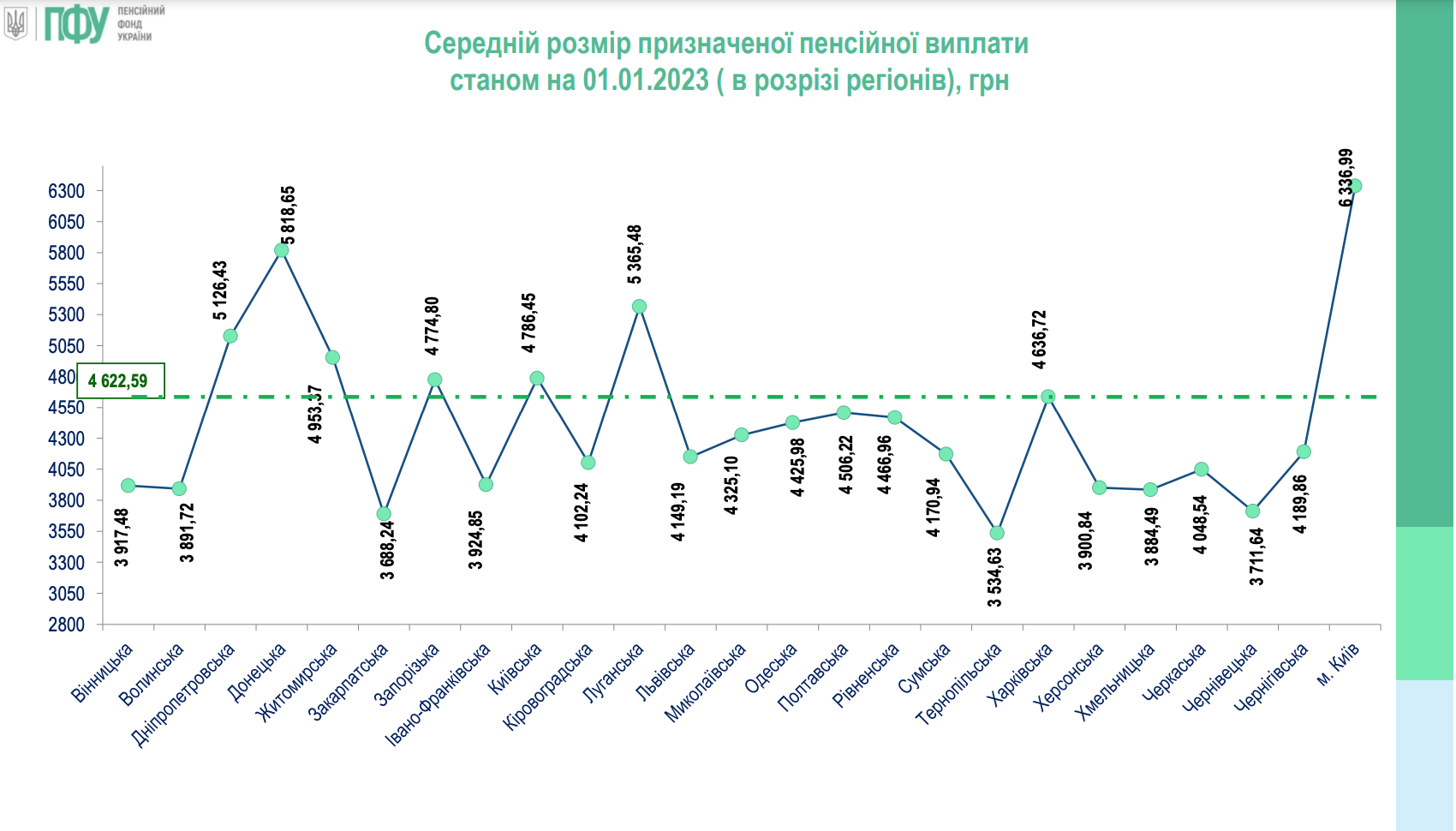 По информации ПФУ, самые высокие пенсии, традиционно получают в Киеве. В столице размер средних ежемесячных выплат для пенсионеров составляет 7129 гривен. Далее следуют Донецкая (6560 грн), Луганская (6049 грн), Днепропетровская области (5804 грн).