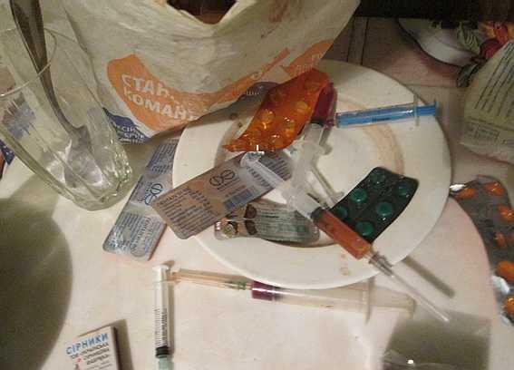 Наркотическое вещество кодеин человек изготавливал на кухне из различных медпрепаратов. С места происшествия правоохранители изъяли шприцы с готовым к употреблению наркотиком, лекарства и принадлежности, с помощью которых наркоделец изготовлял это «зелье».
