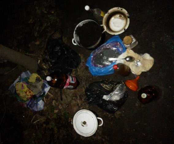 Обследовав местность, милиционеры также обнаружили бутылки с остатками жидкости коричневого и белого цвета, с кристаллическим веществом белого цвета, около 2 килограммов семян мака и медицинские шприцы.