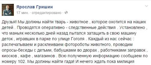 "Друзья! Мы должны найти тварь - животное , которое охотится на наших детей. Проводятся оперативно - следственные действия . Установлено , что маньяк несколько дней назад пытался затащить в свою машину деток , игравших в парке по улице Гоголя . Каждый из нас сейчас : распечатываем и расклеиваем фотороботы животного, проводим опросы-беседы с детьми, бабушками во дворах , работниками заправок , киосков , кафе , магазинов . Всю полученную информацию сообщаем по номеру 102. Мы должны найти гада! И нечего ждать пока милиция сделает это без нас", - написал Гришин.