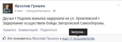 "Друзья ! Подонка маньяка задержали на ул. Кремлевской ! Задержание осуществили бойцы Запорожской Самообороны", - об этом на своей странице в ФБ написал правозащитник Ярослав Гришин.