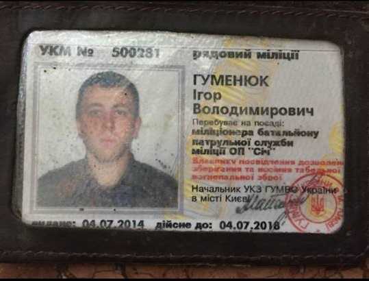 Фото удостоверения милиционера из батальона "Січ" Игоря Гуменюка появилось в сети. Его обвиняют в броске гранаты в группу бойцов Нацгвардии под Верховной радой в Киеве. От взрыва погиб солдат срочной службы и десятки человек были ранены.