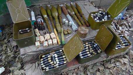 Правоохранители изъяли из тайника, который был оборудован в заброшенном частном доме, более 300 гранат к гранатометам АГС-17 и РПГ, три подствольные и две ручные гранаты РГД, большое количество патронов различного калибра и прочее.