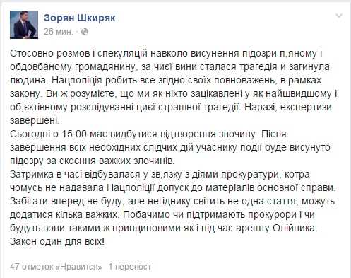 Задержка во времени происходила в связи с действиями прокуратуры, которая почему-то не давала Нацполиции допуск к материалам основного дела", - написал Шкиряк.