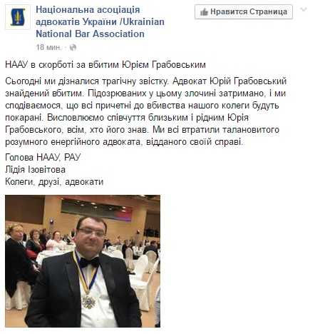 "Сегодня мы узнали трагическую весть. Адвокат Юрий Грабовский найден убитым. Подозреваемых в этом преступлении задержано, и мы надеемся, что все причастные к убийству нашего коллеги будут наказаны. Выражаем соболезнования близким и родным Юрия Грабовского, всем, кто его знал. Мы все потеряли талантливого умного энергичного адвоката, преданного своему делу", - говорится в сообщении.