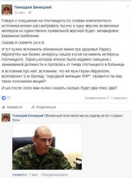 Свое мнение по поводу покушения высказал в Фейсбуке известный блогер Геннадий Беницкий, новость Донбасса передает Час Пик.