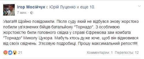 "Внимание!!! Только что сообщили. После суда, который не состоялся снова жестоко избили заключенных бойцов батальона "Торнадо". С особой жестокостью избивали главного свидетеля по делу Ефремова зам комбата "Торнадо" Николая Цукора. Видимо кто-то очень хочет, чтобы он отказался от своих показаний. Выясняю подробности. Прошу максимальный репост" - написал Мосийчук.