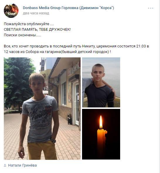 В Горловке Донецкой области, которая временно оккупирована боевиками "ДНР", обнаружили труп 23-летнего Никиты Шевченко, который пропал осенью 2016 года. Об этом сообщают родные парня в социальных сетях.
