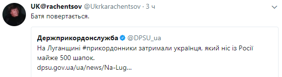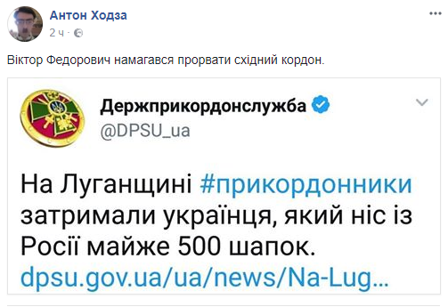 Информацию о возможном нарушении границы пограничники получили оперативным путем. В дальнейшем, на расстоянии 5 м от границы, в районе населенного пункта Травневое Луганской области задержан гражданин Украины, который пытался переместить через границу трикотажные шапки в ассортименте. Всего нарушитель перемещал 4 сумки, в которых было 490 шапок российского производства на общую сумму более 60 тыс. гривен.