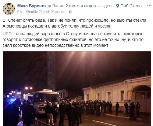 В центре Харькова в ночь на 1 ноября группа молодых людей разнесла местный паб под названием «Стена». Инцидент произошел на улице Рымарской. По рассказам очевидцев в массовой драке принимали участие футбольные фанаты.
