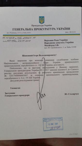 В ответе Генпрокуратуре указано, что сведения внесены в ЕРДР, уголовное производство открыто по признакам, предусмотренным ч. 4 ст.191 УКУ (присвоение или растрата чужого имущества).