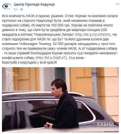 Добавим, «Центр противодействия коррупции» сообщает, что НАПК просит суд наказать чиновника и конфисковать собаку. А вместе с тем «не замечает», что семья Бута купила 2 квартиры в элитных «Новопечерских Липках», а также 2 новых Volkswagen Touareg.
