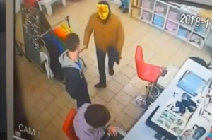 На опубликованном видео видно, как мужчина в маске кота и с топором в руках попытался ограбить магазин. Однако, горе-грабитель был остановлен тремя работниками магазина, которые скрутили преступника и держали его до приезда полиции..