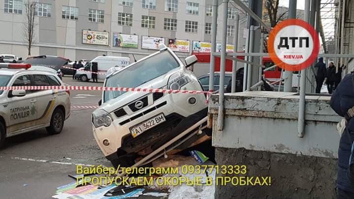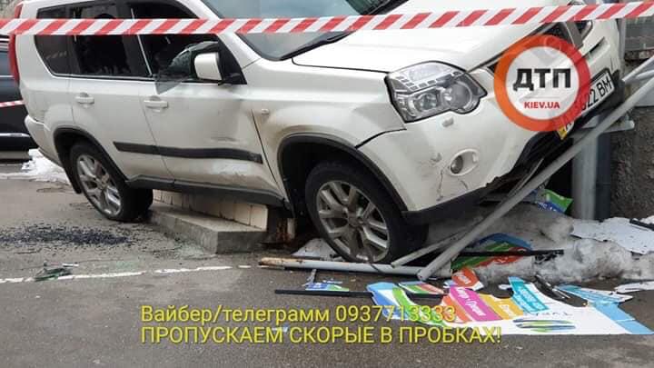 В Киеве на улице Сурикова произошла перестрелка и ДТП. Автомобиль Ниссан залетел на ступеньки магазина. На месте инцидента много полиции, введен оперативный план «Сирена».