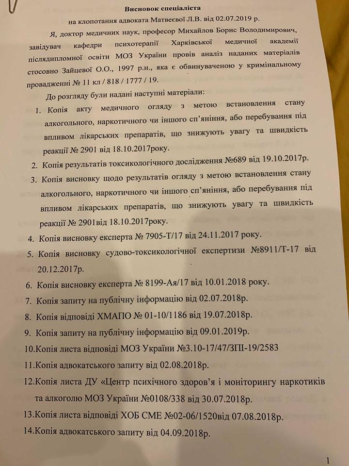 Представительница пострадавших Лариса Матвеева инициирует против них уголовное производство - основой станет заключение психиатра-нарколога Бориса Михайлова - доктора медицинских наук, профессора кафедры психотерапии Харьковской медицинской академии последипломного образования, который изучил документы по делу и заявил - Зайцева находилась под действием лекарственных препаратов с наркотическим эффектом, и для определения этого не надо знать количество опиатов - достаточно лишь факта наличия препарата в организме, а нормативно-правовых документов, определяющих количество наркотических веществ, в Украине не существует.