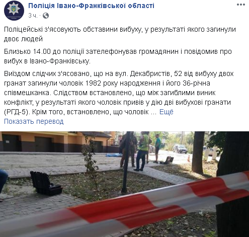 Выездом следственных выяснено, что от взрыва двух гранат погибли мужчина 1982 года рождения и его 36-летняя сожительница, передает Час Пик со ссылкой на пресс-службу полиции города.