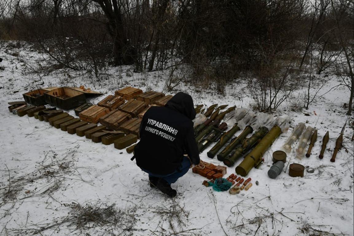 В целом из тайника изъято мины 82 мм, снаряды ВОГ различных модификаций, некоторые со следами переработки, гранаты РГД-5 и Ф-1 с запалами, РПГ различных модификаций, снаряды к РПГ и стартовые двигатели к ним, реактивный пехотный огнемет, тротиловые шашки, снаряды и патроны различных калибров.