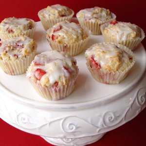 Посыпать клубнику небольшим количеством сахара. Отложите в сторону. В миске взбейте яйца, растопленное сливочное масло, растительное масло, сахар. Добавить ваниль. В кислое молоко добавить соду, добавить к смеси. Высыпьте в нее и клубнику. В другой миске просеять муку и смешайте его с порошком для выпечки. Добавить муку к смеси продуктов. Перемешать аккуратно. Смесь выливают в смазанные формы для кексов и заполняют на 2/3 объема. Посыпать коричневым сахаром. Выпекать в предварительно разогретой духовке до подрумянивания. Растопить на водяной бане белый шоколад и полить кексы.