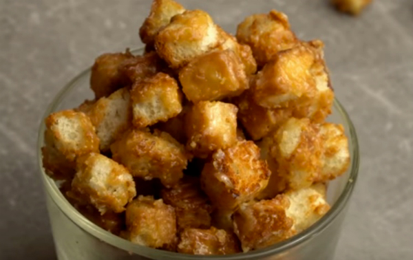Берем, свой любимый батон и нарезаем на полоски, а затем кубиками. Ставим сковороду на плиту для прогрева. Как только закончили с хлебом, сразу выкладываем хлебные кубики на сковороду. Все время помешивая, делаем сухарики. На сковороде будут крошки хлеба, но они нам не понадобятся, используем только красивые кубики.