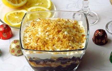 Для приготовления салата нужно взять яблоки, чернослив, сахарную пудру, сахар-песок, коньяк, ядра грецких орехов, половину лимона, сметану и ванилин. Чернослив залить небольшим количеством подслащенной горячей воды и оставить на 10 минут. Сливу остудить, вынуть косточки и порезать соломкой. Яблоки очистить от кожуры и семян и нарезать тонкой соломкой. Яблоки посыпать 1 ст. л. сахара, сбрызнуть лимонным соком и коньяком, перемешать и оставить на 30 минут для пропитки. Чернослив и яблоки выкладывать в салатник послойно.
